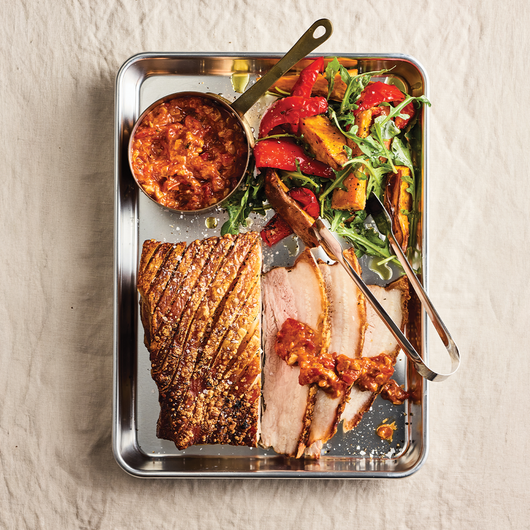 Rest the pork for 10 minutes before slicing (for easier slicing, flip the pork so the skin is on the board).