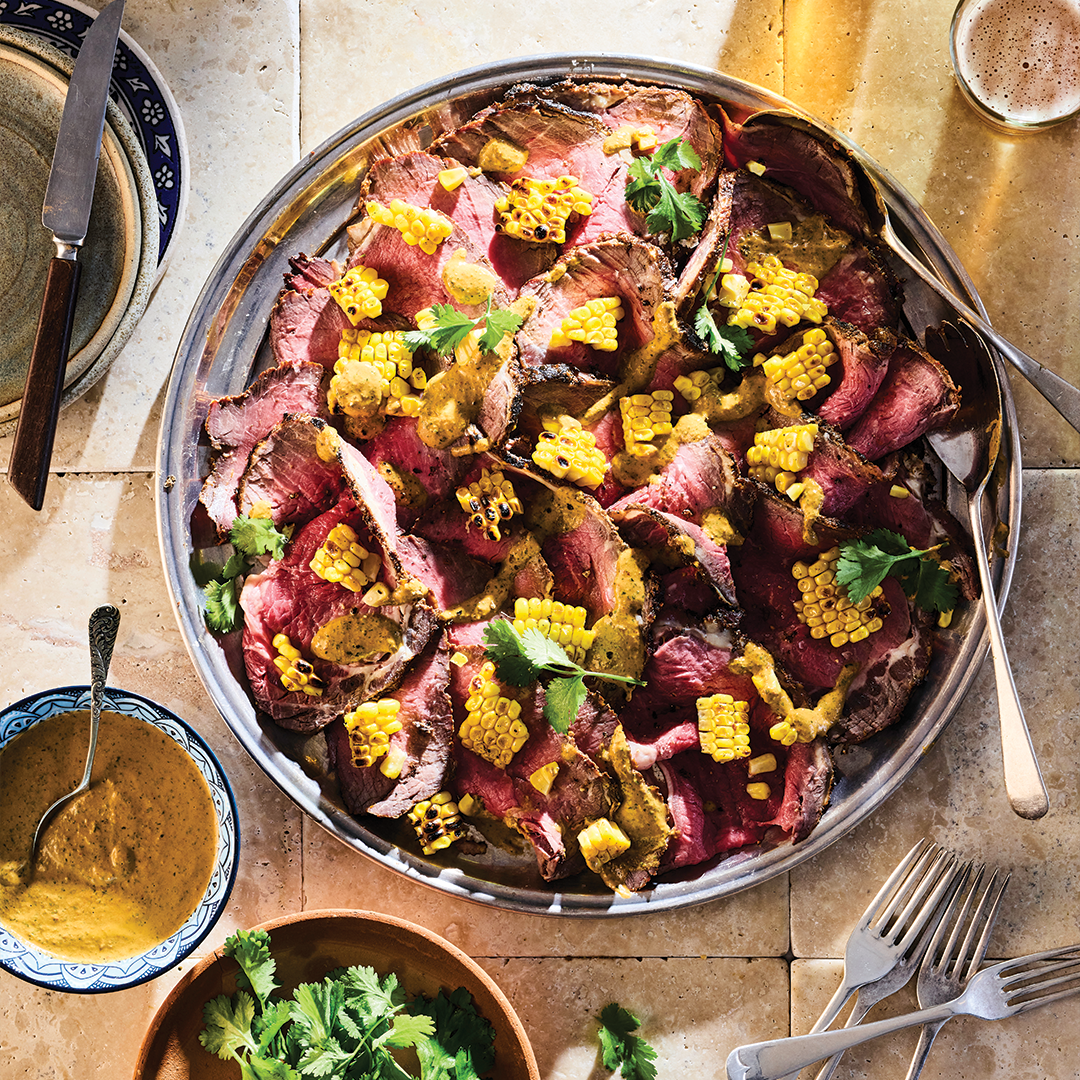 To serve, put the sliced beef on a platter, drizzle with some of the chipotle mayonnaise, and sprinkle over the corn and coriander leaves.
