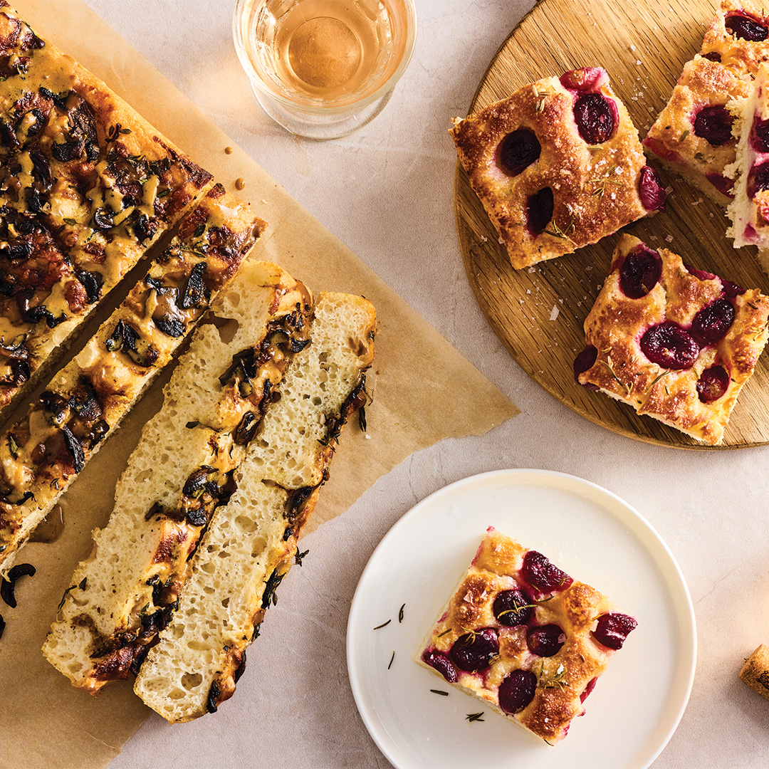 Don’t be scared of the length of time this takes — it’s very much hands off, and most of the flavour gets developed in the overnight proving in the fridge. This basic dough is very adaptable to whatever toppings you wish to add — we’ve gone with one sweet and one savoury option.