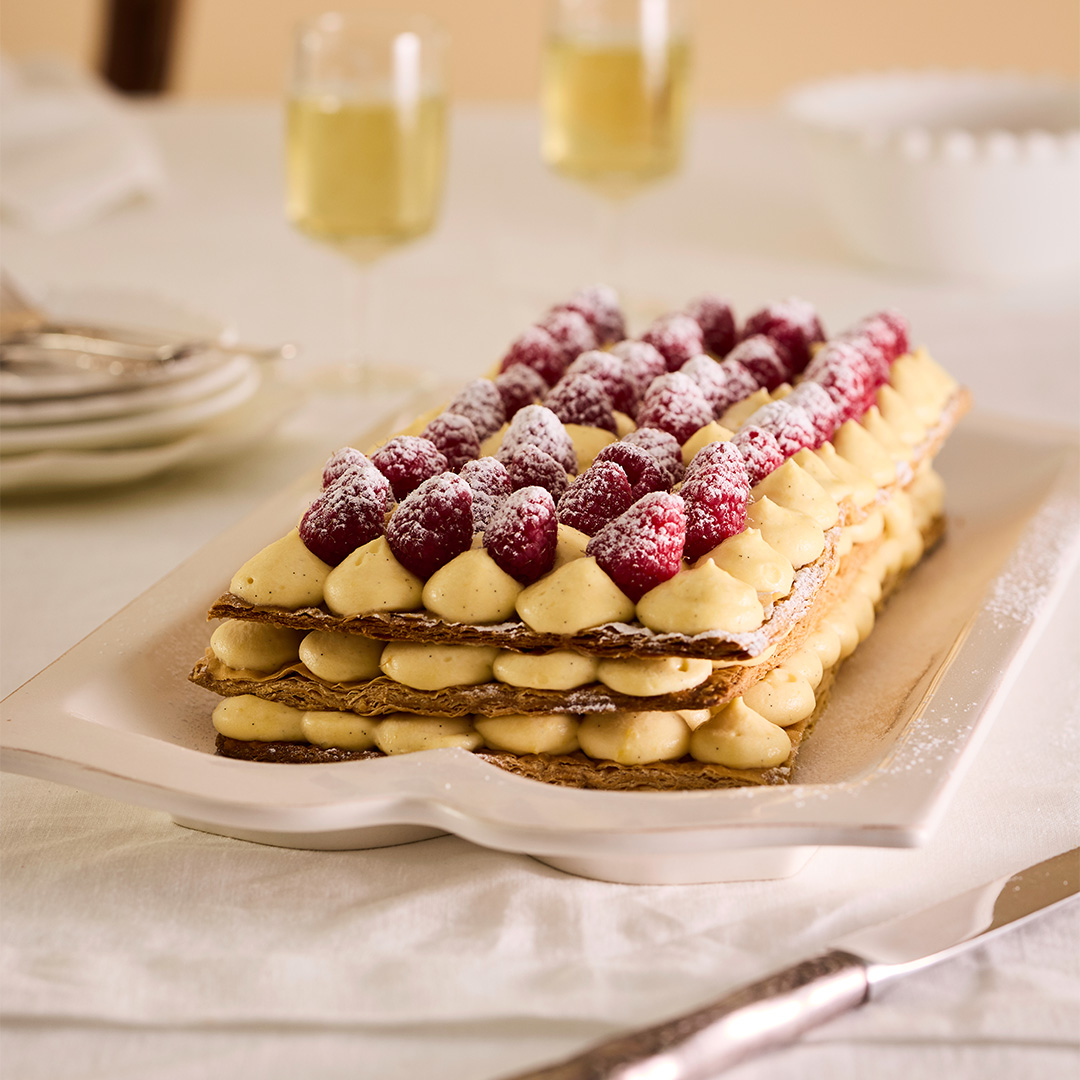 On a serving tray, put a small blob of the crème pâtissière to help hold the pastry in place. Add one layer of pastry. Pipe the filling over the pastry (or smear it smoothly with a spatula). Top with another piece of pastry and repeat until you have 3 layers of pastry and crème pâtissière. Arrange the berries on top. Dust with icing sugar before serving.