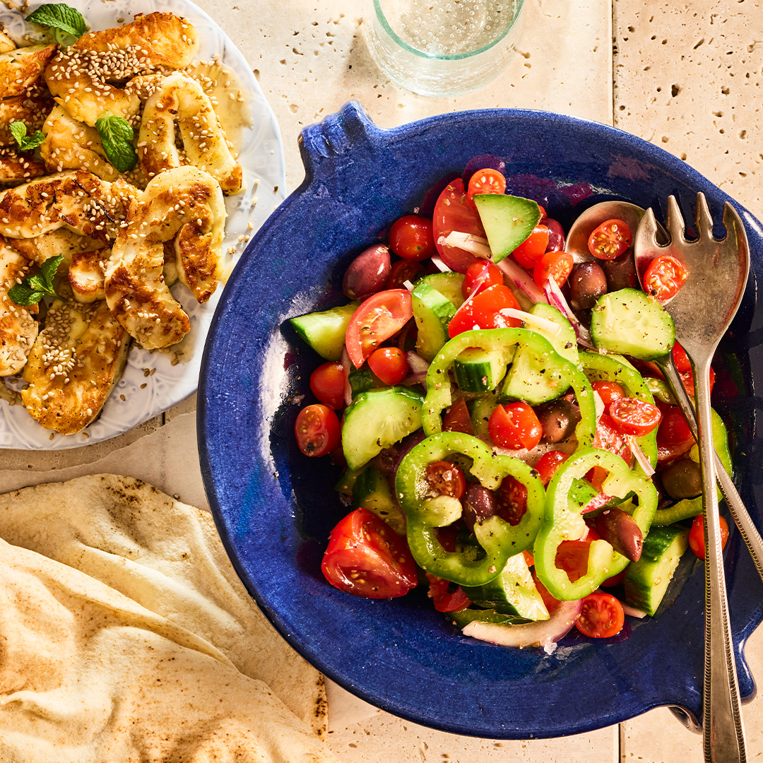 Greek salad is always a favourite. Usually paired with feta, here we’re changing it up and serving it with fried halloumi that is drizzled with honey and sesame seeds.