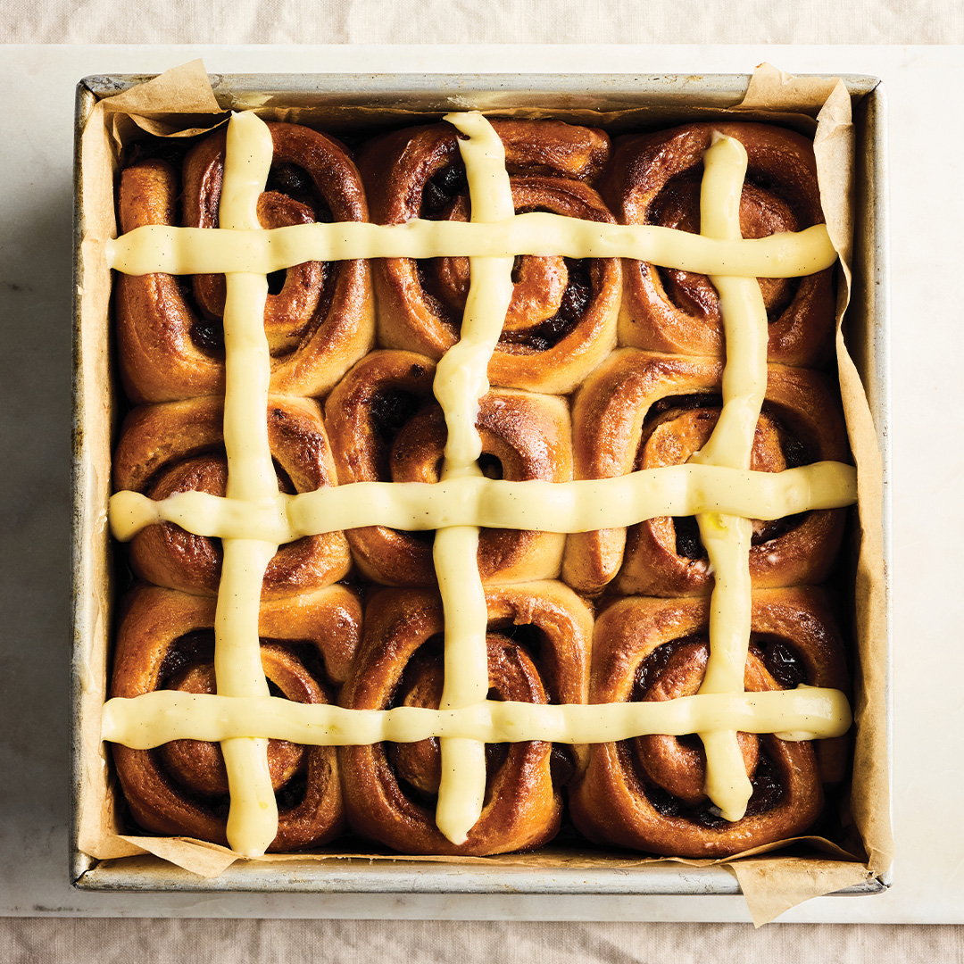 Combine the ingredients for the glaze and brush over the buns when they come out of the oven. Leave to cool for 15 minutes before piping icing crosses over the buns.