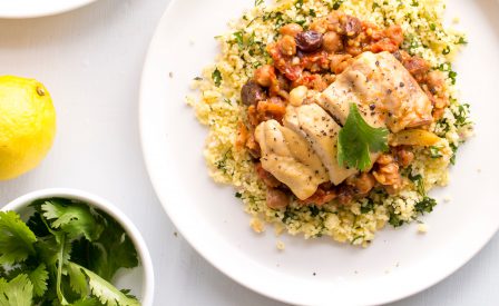 Serve the herbed couscous topped with the bean tajine, oven-roasted chicken thighs and a sprinkle of fresh coriander